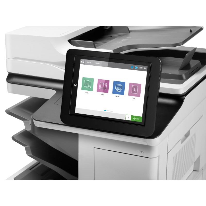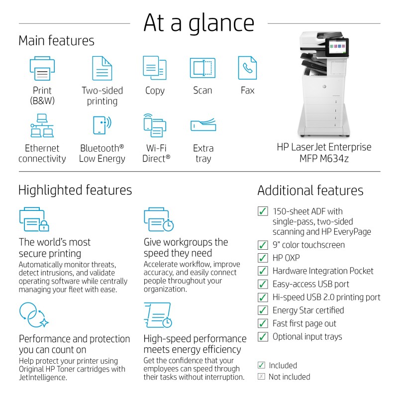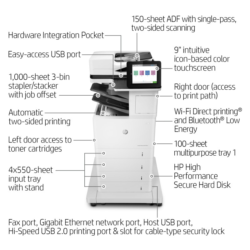 HP LaserJet Enterprise M634z Wireless Multifunction Black and white Printer, Copier, Scanner; Duplex. Print technology: Laser, Printing: Mono printing, Maximum resolution: 1200 x 1200 DPI. Copying: Mono copying, Maximum copy resolution: 600 x 600 DPI. Scanning: Color scanning, Optical scanning resolution: 600 x 600 DPI. Faxing: Color faxing. Duplex functions: Print, Copy. Maximum ISO A-series paper size: A4. Wi-Fi. Direct printing. Product color: Black, White